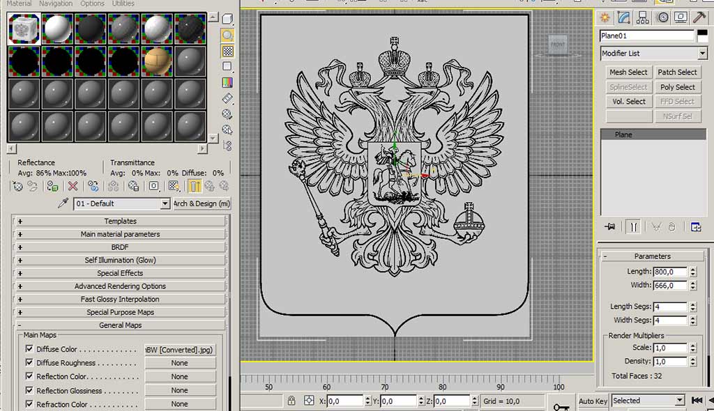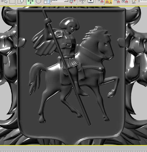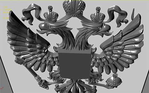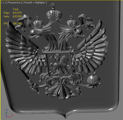 На всё про всё (перемещения точек туда сюда, клонирование, и так далее) ушла 1 рабочая неделя. Труден путь создания 3ds модели. Станок ЧПУ фрезерный гравировальный тоже потрудился. Машинное время 12 часов. Заказ резного декора (барельефа) Герба РФ выполнен.