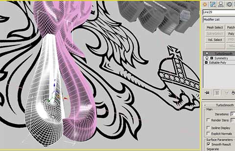 Профиль сечения отдельных элементов 3ds модели орла сделал по аналогу работы барельефа герба РФ дизайнера с ником sculptorr с форума Сапр 2000. Точки "а" разместил близко друг от друга, что обеспечило в программе 3ds max при сглаживании TurboSmooth резкую грань в этом месте.
